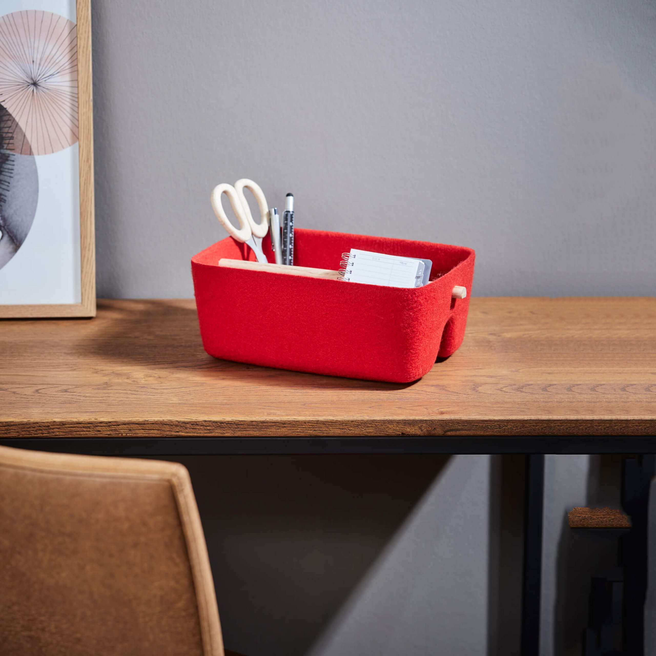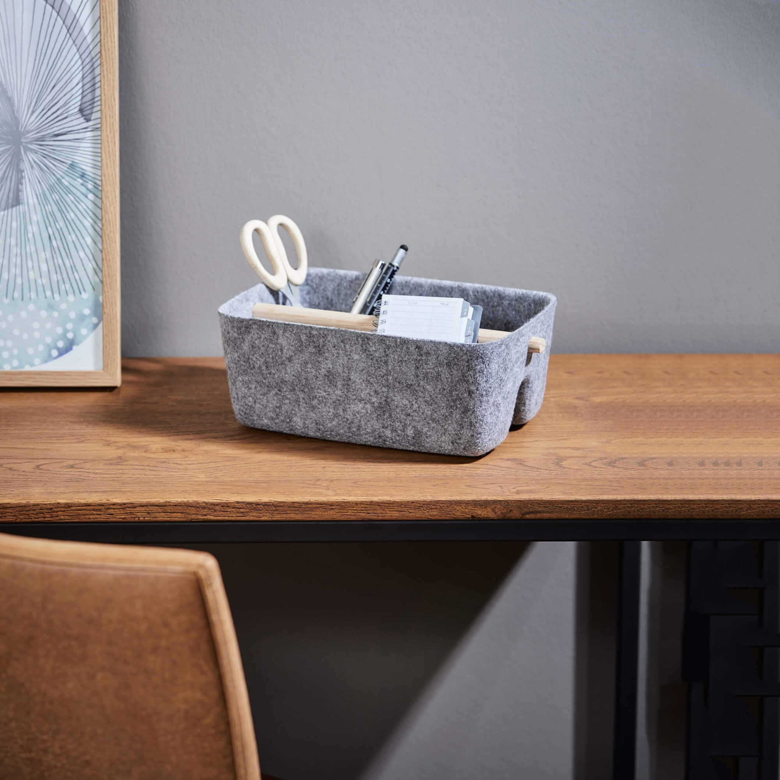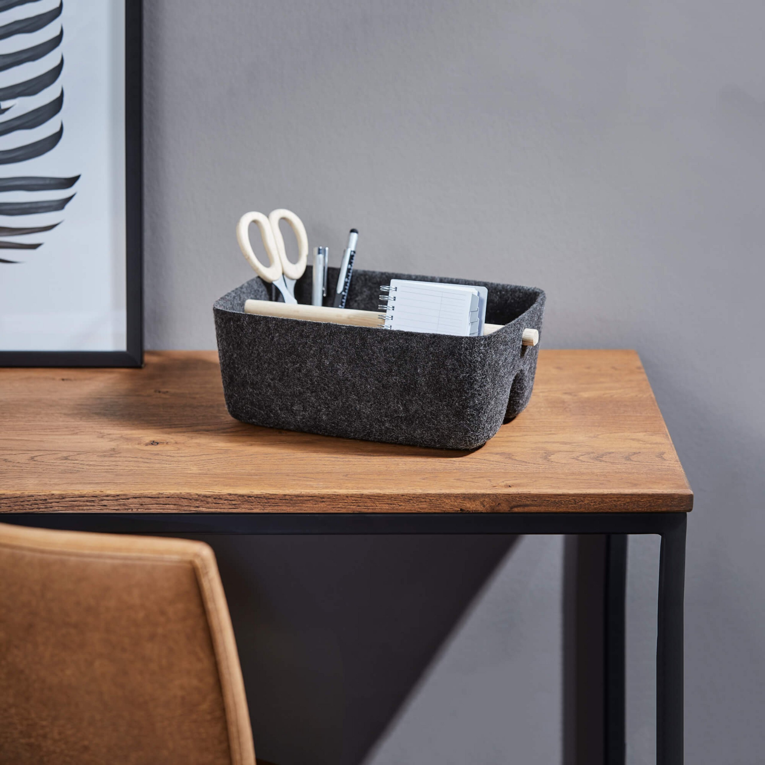 Abmessung: H 11 cm x B 26 cm x T 18 cm Material: Filz Optik, Griff Eiche